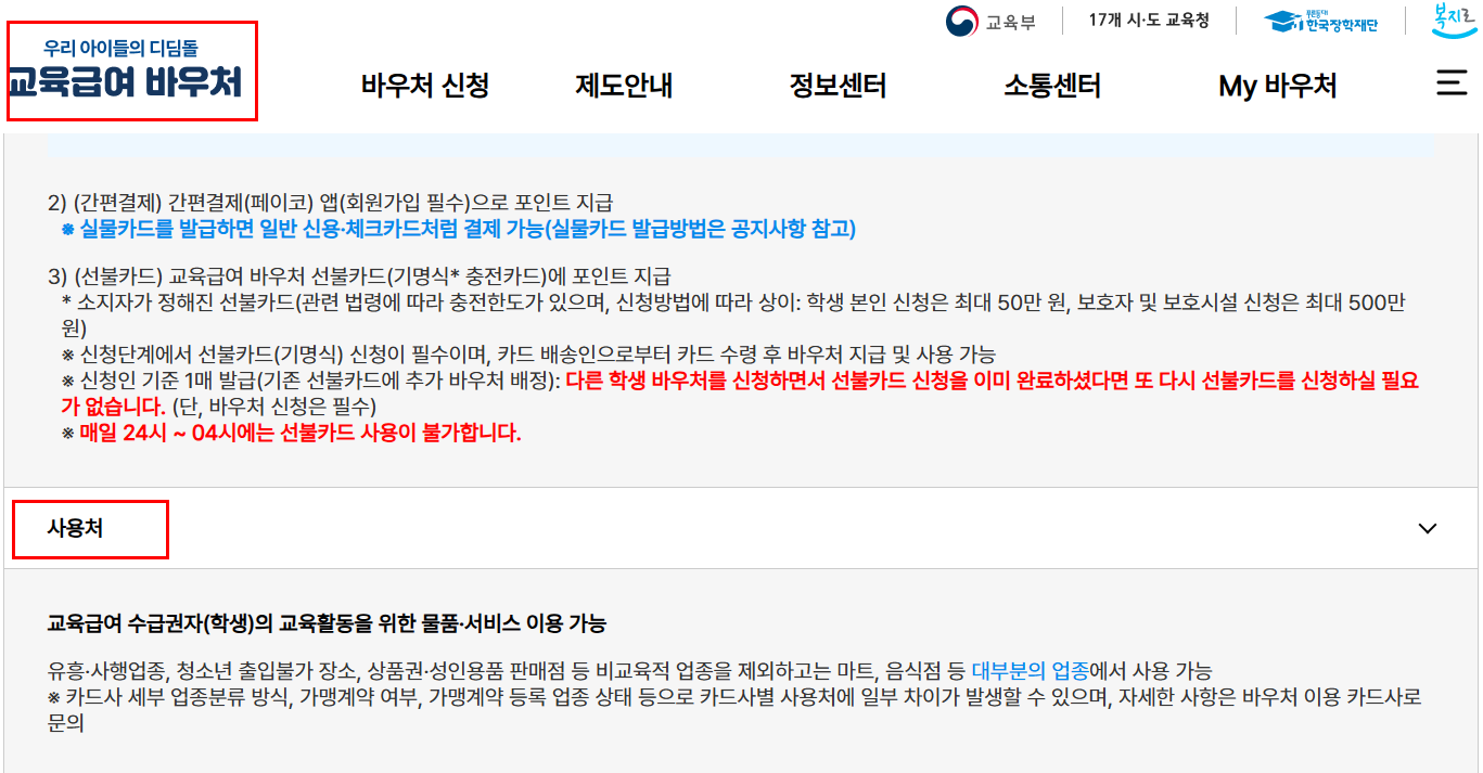 | 주요 사용처 | 문구점, 서점, 교육몰, 바우처 지정 온라인몰 |