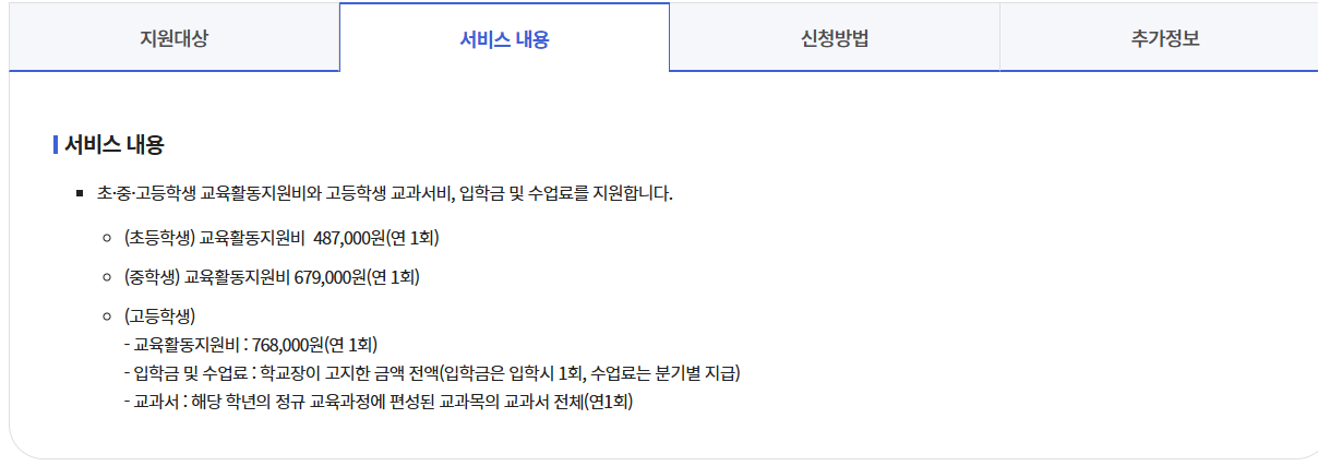- 고등학생: 연 768,000원 + 입학금·수업료 등 별도 지원(해당 시)