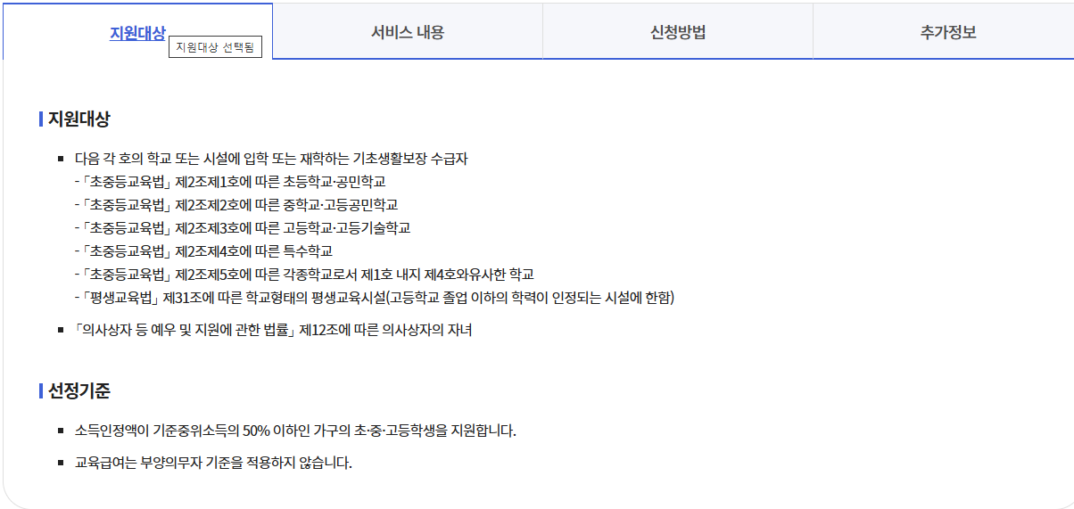| 신청대상 | 기준 중위소득 50% 이하 가구의 초·중·고 학생 |