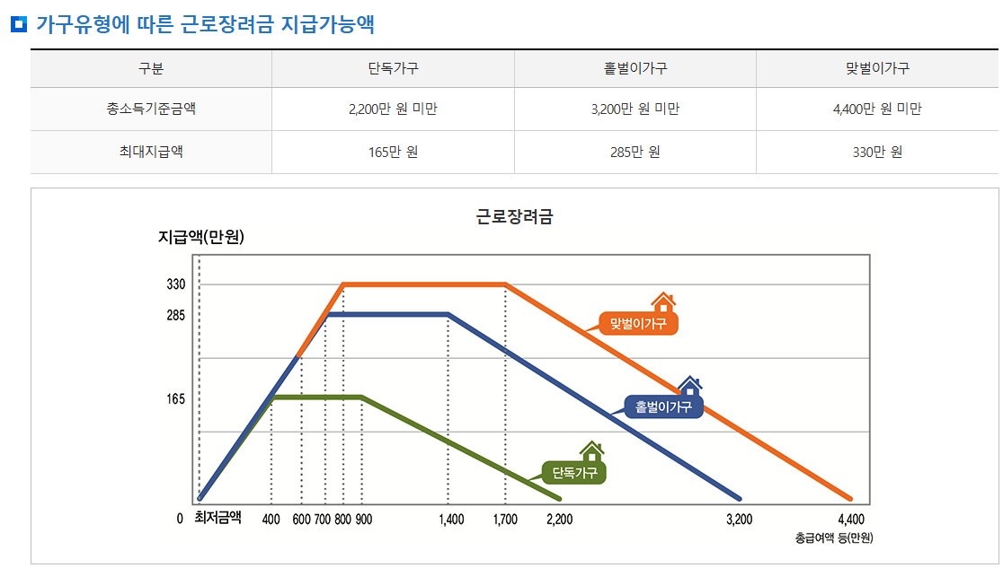 즉, 일정 수준의 근로소득이 있어야 근로장려금 금액을 제대로 받을 수 있다는 뜻입니다.