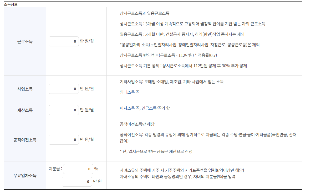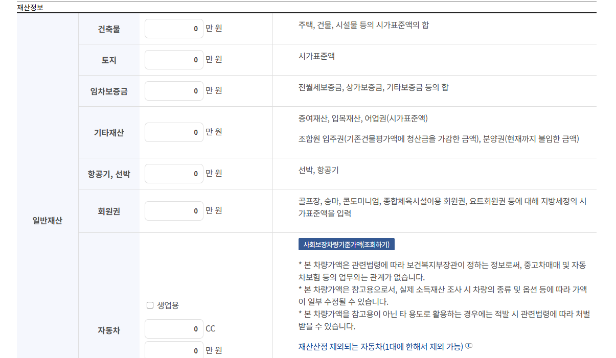 - 재산의 소득환산액 (집, 예금, 자동차 등 재산을 월 소득으로 환산)