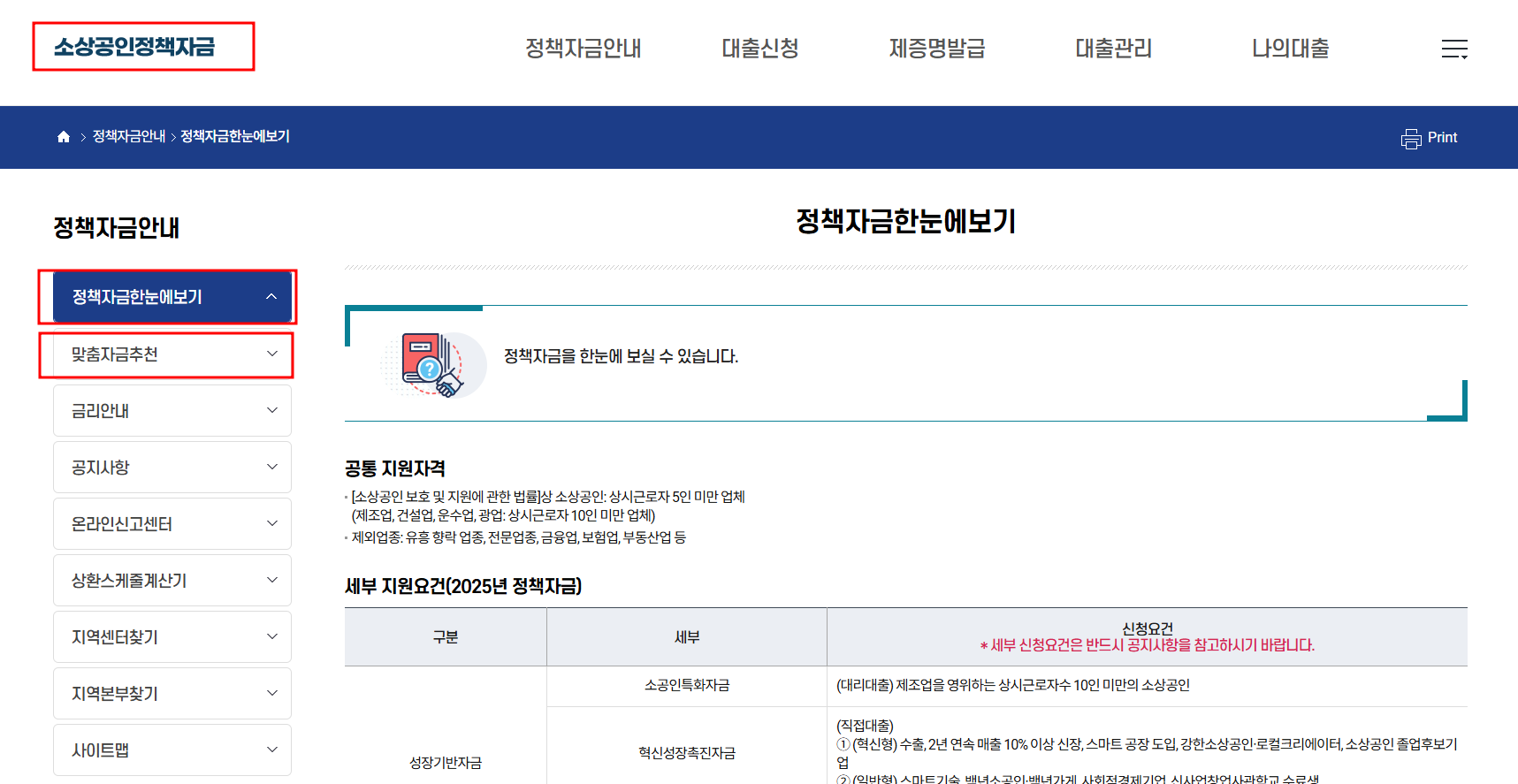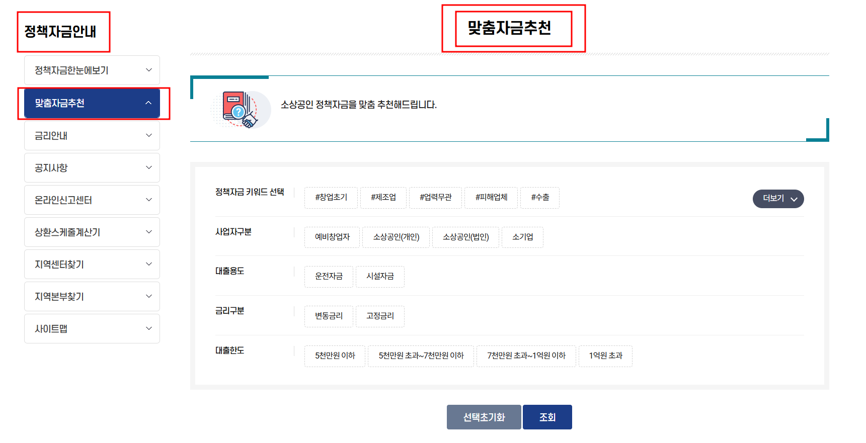 ‘정책자금 맞춤검색’ 기능이 있어요.