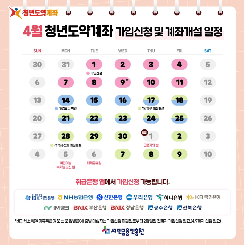 • 각 은행 앱 또는 청년도약계좌 공식 홈페이지에서 매월 신청 일정이 공지되니, 미리 확인하고 캘린더에 체크해두세요.
