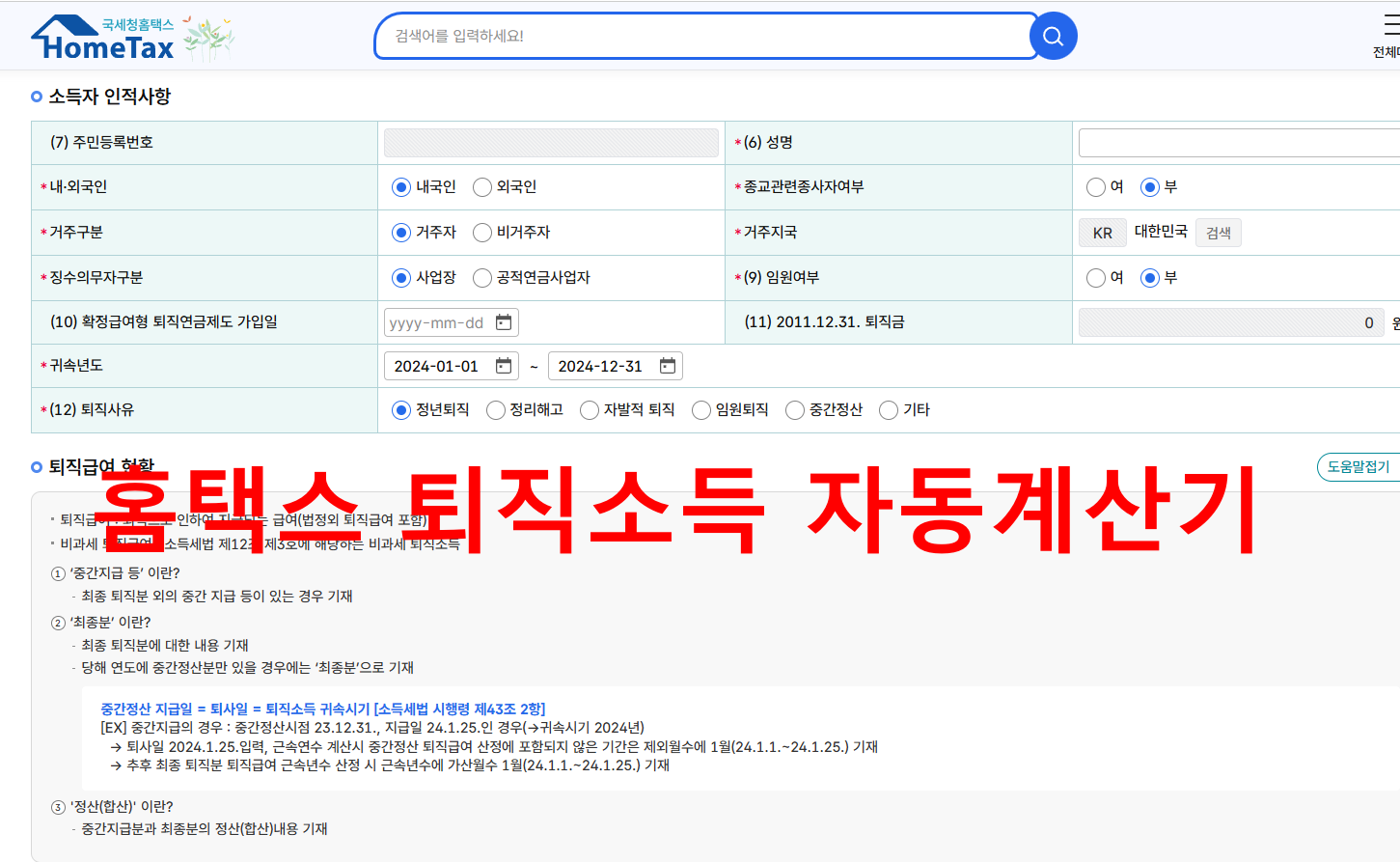 1. 국세청 홈택스 퇴직금 세금 자동계산기